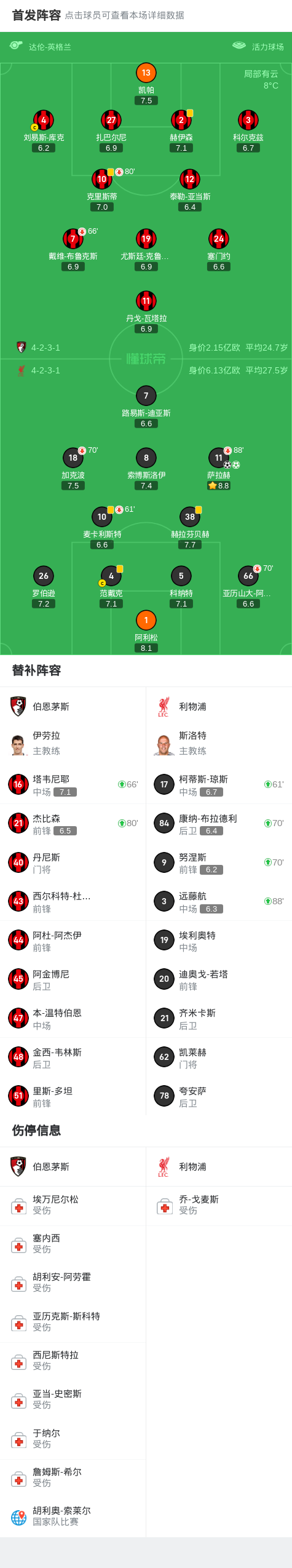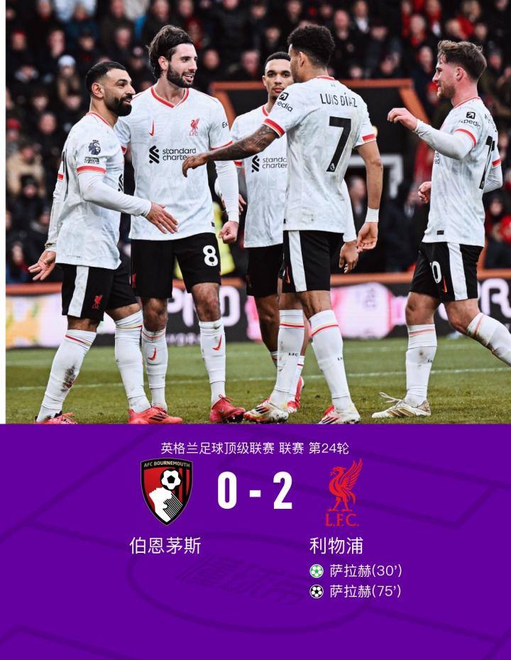最终比赛结束,利物浦客场2-0击败伯恩茅斯,也让伯恩茅斯此前的11轮不败纪录遭到终结。在比赛中,索博斯洛伊、戴维-布鲁克斯等伯恩茅斯主力受伤无法登场,给球队的整体表现造成了影响,而利物浦则在萨拉赫的发挥下取得了一场关键的胜利。